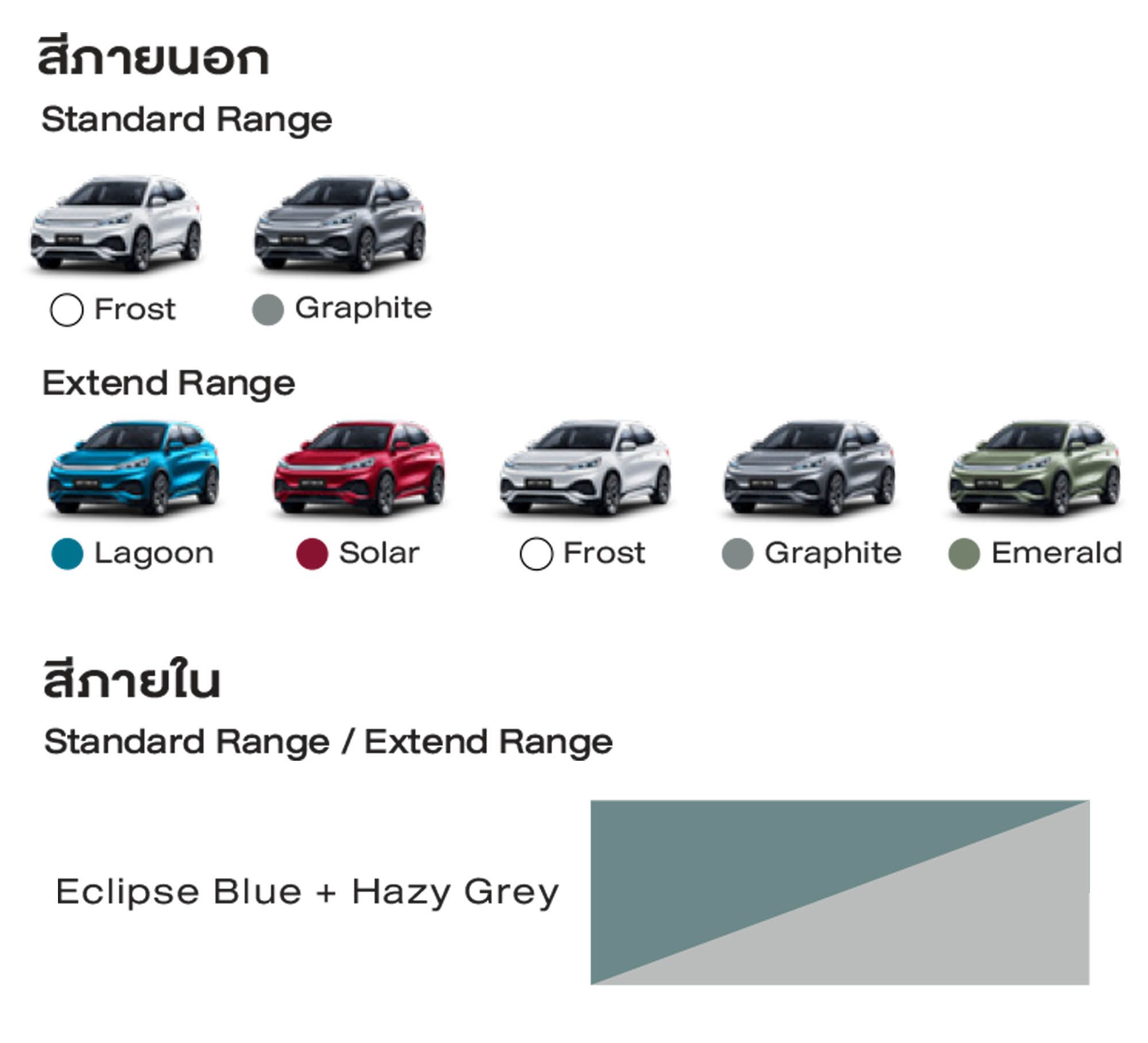ตารางภาพแบ่งรายละเอียด รุ่นและสี ของ BYD ATTO 3 ที่จำหน่ายในประเทศไทย โดยในรุ่น Standard Range และ Extend Range นั้น จะมีสีให้เลือกที่แตกต่างกัน เราได้สรุปไว้ในภาพให้เรียบร้อย เพื่อการเลือกสีให้เข้ากับไลฟ์สไตล์ของเรา
