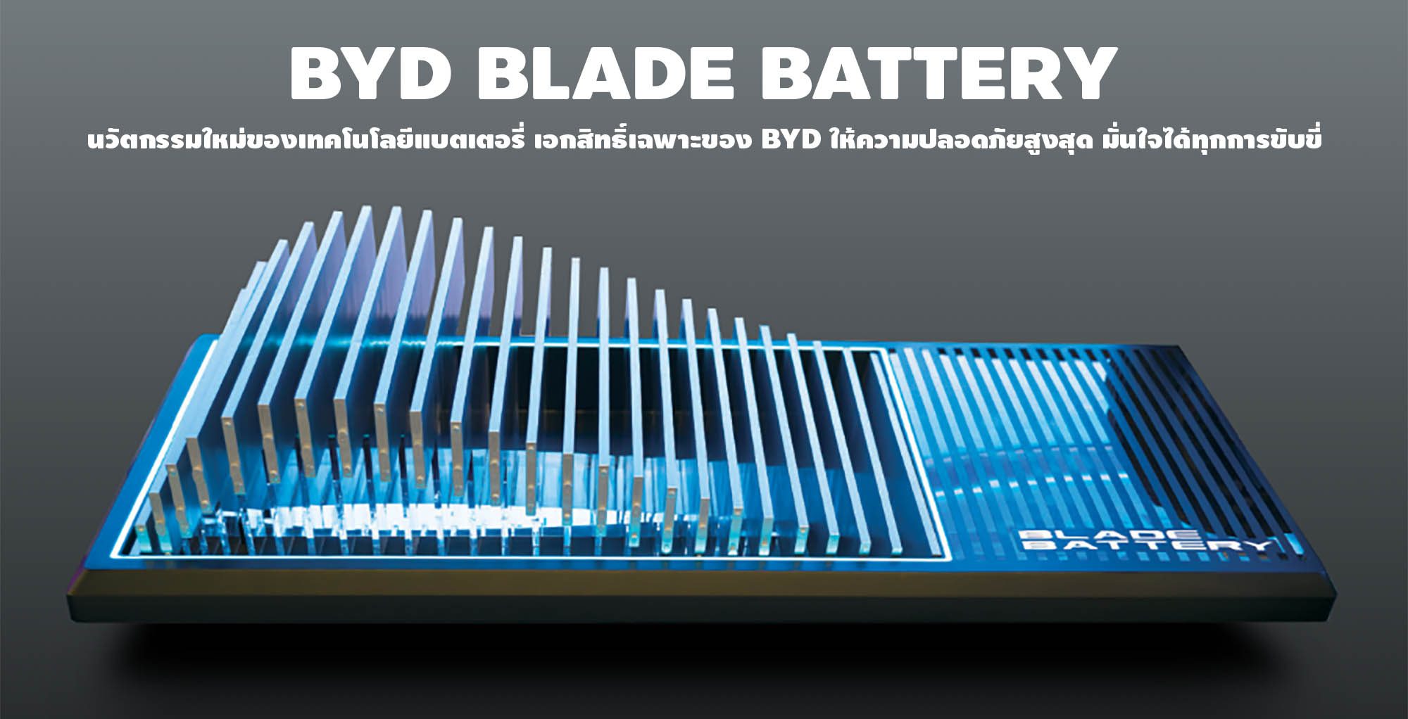 BYD BLADE Battery นวัตกรรมใหม่ของเทคโนโลยีแบตเตอรี่ เอกสิทธิเฉพาะของ BYD ให้ความปลอดภัยสูงสุด มั่นในในทุกการขับขี่ คำนึงถึงความปลอดภัยสูงสุด เพื่อมอบความสะดวกสบาย และความมั่นใจให้คุณตลอดการเดินทาง ออกแบบมาพร้อมรับมือในทุกสถานการณ์ ด้วยโครงสร้างที่แข็งแรง คำนึงถึงการป้องกัน “แบตเตอรี่ (Battery)” ซึ่งเป็นหัวใจสำคัญของรถยนต์พลังงานไฟฟ้า