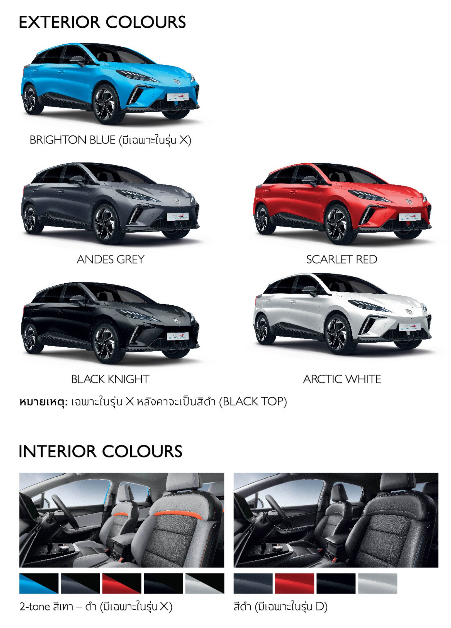 รถไฟฟ้า NEW MG4 ELECTRIC ICON ออกมาให้จับจองช่วงปลายปี 2022 ที่งาน THAILAND INTERNATIONAL MOTOR EXPO 2022 โดยมีให้เลือกจับจองทั้งหมด 5 สีแยกเป็น 2 รุ่นคือ รุ่น D และรุ่น X ซึ่งทั้ง 2 รุ่นนี้แทบจะเหมือนกันเลย หากดูตาม Specification แล้วจะเห็นว่า ภายนอก จะต่างกันเรื่องสีบนหลังคา คือรุ่น X จะมีหลังคา BLACK TOP สีดำทั้งหมด และมีสีเพิ่มขึ้นมาอีกสี คือ สี BRIGHTON BLUE นอกจากนั้นสิ่งที่ต่างกันสำหรับรุ่น D และรุ่น X คือระบบอำนวยความสะดวก และระบบช่วยเหลือความปลอดภัยต่างๆ ซึ่งจะมีรายละเอียดให้ดูดังตารางต่อไป